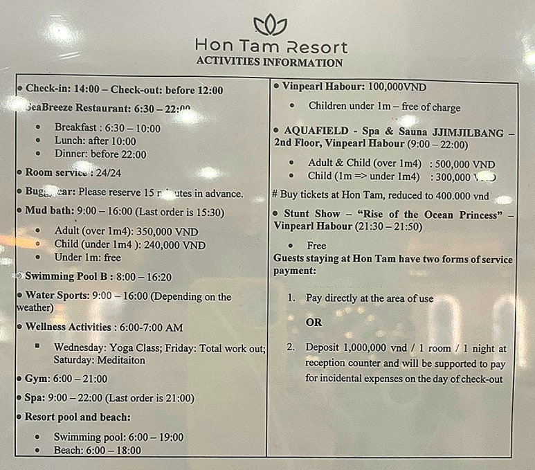 - 리조트 내 Aquafield 및 스프링 스파 운영. 베트남 스타일 마사지, 페이셜, 바디스크럽 등 제공.