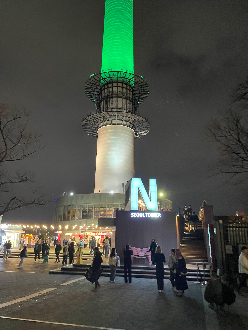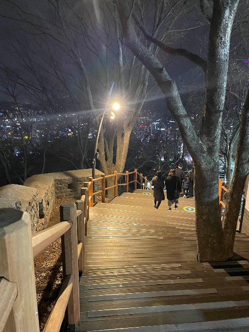 중턱에 하차한다. 계단으로 꽤 올라가야 서울타워가 나온다. 하차한 지점에는 카페와 음식점, 간식거리 파는 스탠드가 있다. 우리가 도착했을 때 8시가 안된 시간이었는데 마지막 오뎅이 막 다 팔린 참이었다.
