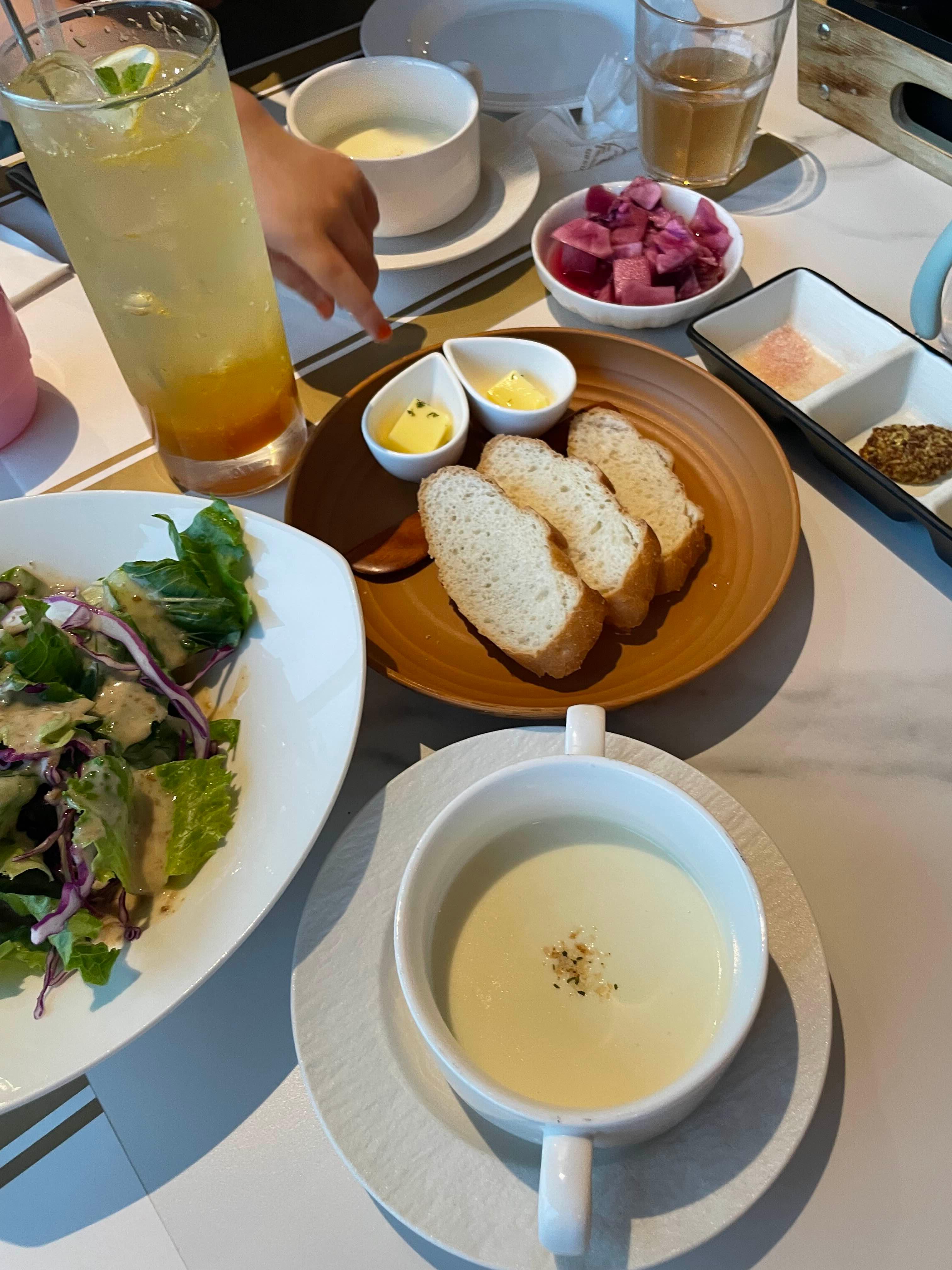 우리는 4명이므로 거대한 세트에다가 추가로 더 주문하여 풍족하게 먹음. 식전빵과 스프, 샐러드부터 시작.