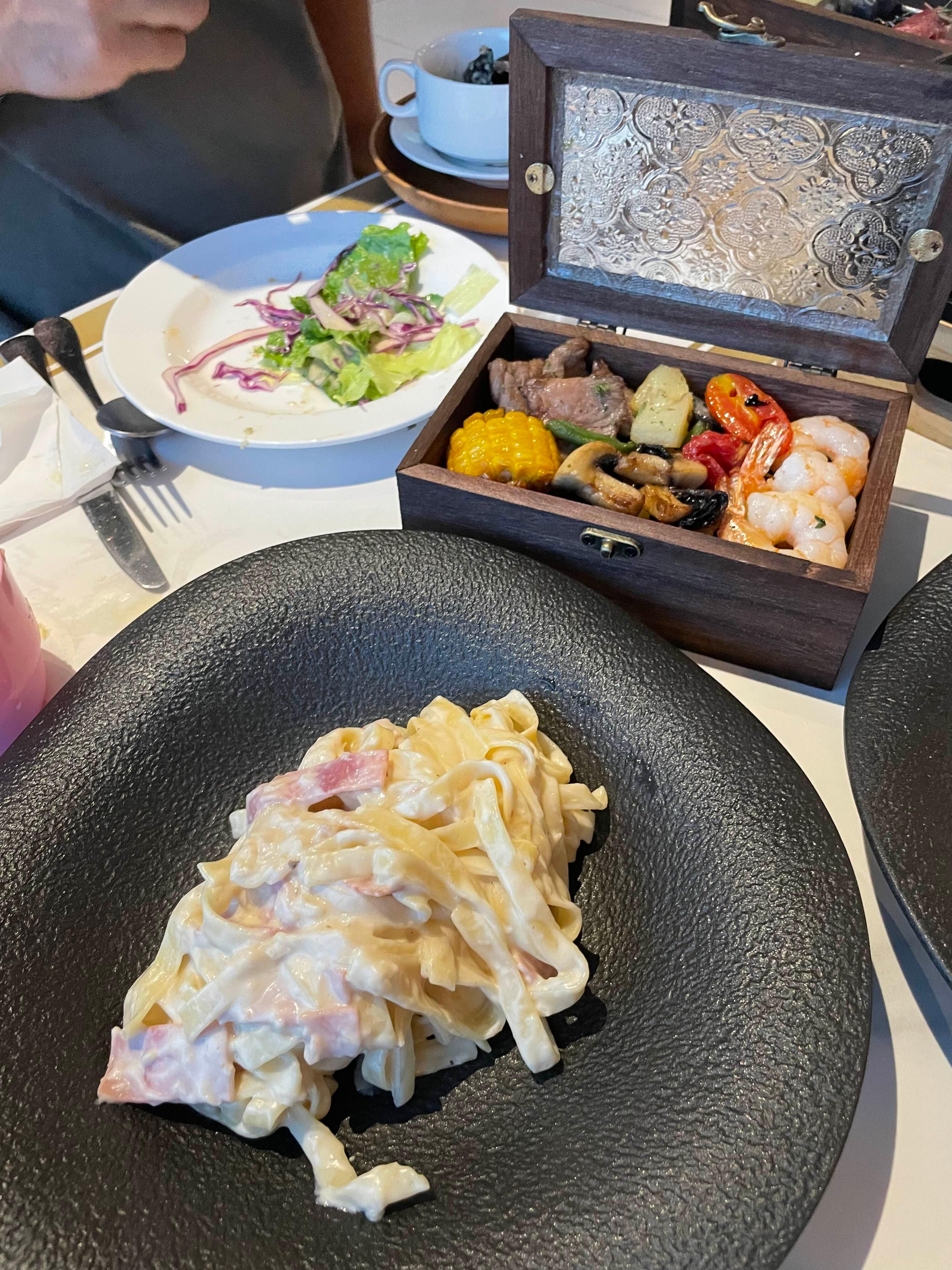 파스타를 시켰더니 소량의 스테이크와 새우, 야채가 함께 나왔다.